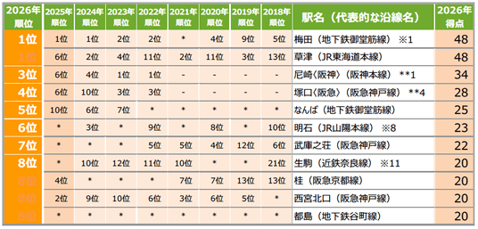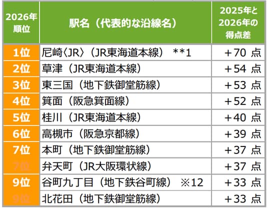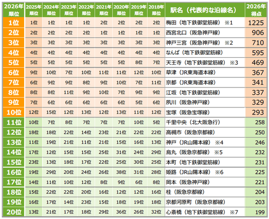 1位は5年連続で「梅田」、得点は「尼崎〈JR〉」が躍進 穴場な街ランキングでは「草津」が初の1位に