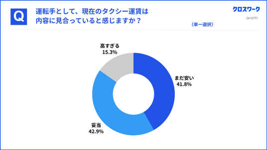 現状の運賃が仕事内容に見合っているかを聞いたところ、「妥当」(76名、42.9%)、「まだ安い(もっと高くてもよい)」(74名、41.8%)と回答しました。