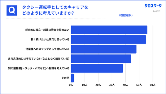 一方で、「独立・起業の資金を貯めたい」(56名、31.6%)、「他業界へのステップにしたい」(48名、27.1%)、「別の運輸業(トラック・バス)への転職を検討」(38名)といった回答も見られました。44名(24.9%)は「まだ具体的に考えていない」としています。