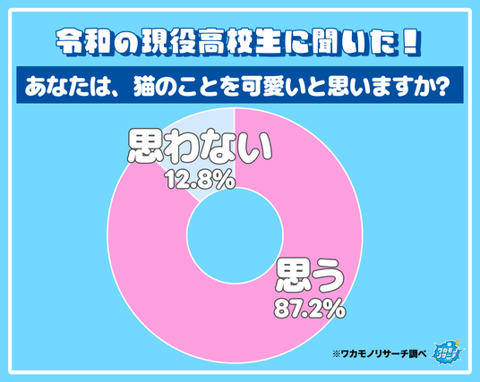 次に猫を可愛いと思っている人とそう思っていない人の意見をまとめてみました。その結果「可愛いと思っている」が87.2.%で「思わないと」回答したのが12.8%となりました。