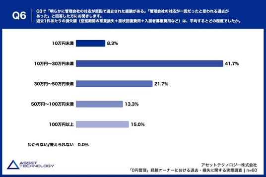「Q6. Q3で「明らかに管理会社の対応が原因で退去された経験がある」「管理会社の対応が一因だったと思われる退去があった」と回答した方にお聞きします。退去1件あたりの損失額(空室期間の家賃損失+原状回復費用+入居者募集費用など)は、平均するとどの程度でしたか。」(n=60)と質問したところ、「10万円未満」が8.3%、「10万円~30万円未満」が41.7%、「30万円~50万円未満」が21.7%という回答となりました。