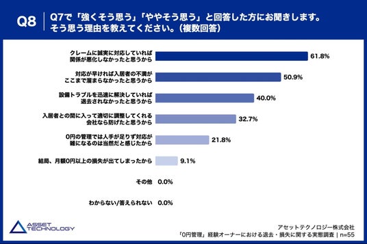 「Q8. Q7で「強くそう思う」「ややそう思う」と回答した方にお聞きします。そう思う理由を教えてください。(複数回答)」(n=55)と質問したところ、「対応が早ければ入居者の不満がここまで溜まらなかったと思うから」が50.9%、「クレームに誠実に対応していれば関係が悪化しなかったと思うから」が61.8%、「設備トラブルを迅速に解決していれば退去されなかったと思うから」が40.0%という回答となりました。