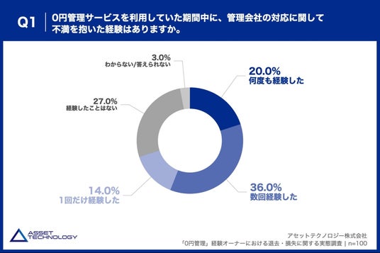 「Q1. 0円管理サービスを利用していた期間中に、管理会社の対応に関して不満を抱いた経験はありますか。」(n=100)と質問したところ、「何度も経験した」が20.0%、「数回経験した」が36.0%という回答となりました。