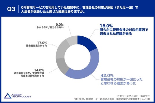不動産テクノロジーを活用した投資用不動産の提案・運用サービスを展開するアセットテクノロジー株式会社(本社:大阪府大阪市、代表取締役:宮本泰光 以下:アセットテクノロジー)は、「月額管理費0円」の管理サービスを利用した経験のある賃貸物件オーナー100名を対象に、「0円管理」経験オーナーにおける退去・損失に関する実態調査を実施しましたので、お知らせいたします。
