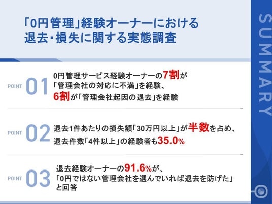 - 01|0円管理サービス経験オーナーの7割が「管理会社の対応に不満」を経験、6割が「管理会社起因の退去」を経験