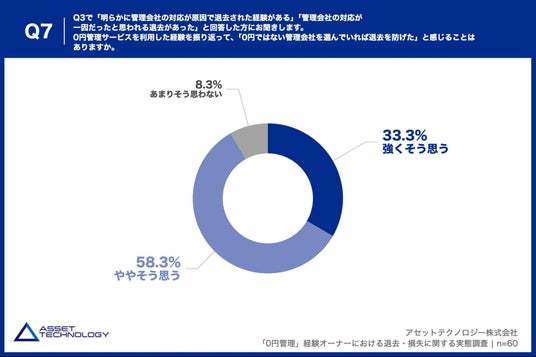 「Q7. Q3で「明らかに管理会社の対応が原因で退去された経験がある」「管理会社の対応が一因だったと思われる退去があった」と回答した方にお聞きします。0円管理サービスを利用した経験を振り返って、「0円ではない管理会社を選んでいれば退去を防げた」と感じることはありますか。」(n=60)と質問したところ、「強くそう思う」が33.3%、「ややそう思う」が58.3%、「あまりそう思わない」が8.3%という回答となりました。