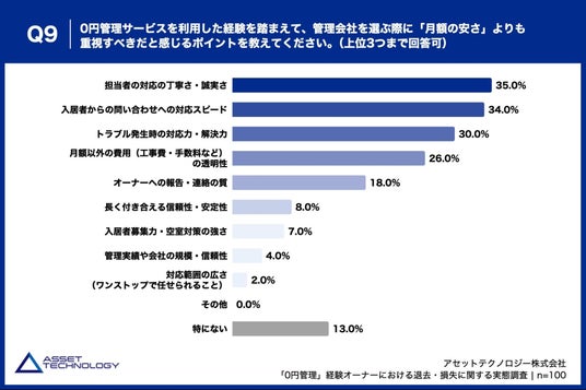 「Q9. 0円管理サービスを利用した経験を踏まえて、管理会社を選ぶ際に「月額の安さ」よりも重視すべきだと感じるポイントを教えてください。(上位3つまで回答可)」(n=100)と質問したところ、「入居者からの問い合わせへの対応スピード」が34.0%、「トラブル発生時の対応力・解決力」が30.0%、「担当者の対応の丁寧さ・誠実さ」が35.0%という回答となりました。