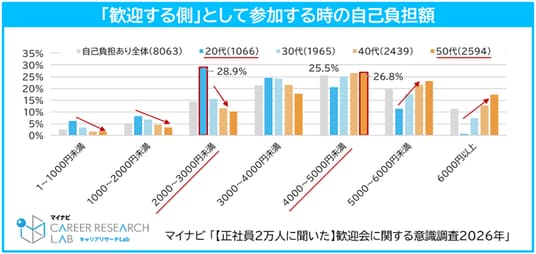 歓迎会における自己負担額について聞くと、「歓迎する側」として参加したものでは全体の74.1%が「自己負担があった」と回答しており、全体の負担額は「4,000~5,000円未満(25.5%)」が最多で、年代が上がるほど高額帯の割合が増加している。