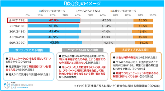 また、「歓迎会」にネガティブなイメージを持つ理由では、費用や時間の負担に加え、アルコール・ハラスメント(アルハラ)への懸念を挙げる声も一部でみられました。