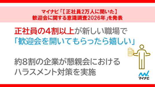 株式会社マイナビ(本社:東京都千代田区、代表取締役 社長執行役員:粟井俊介)は、20~59歳の正社員2万1,798人と企業の中途採用担当者807人を対象に実施した「【正社員2万人に聞いた】歓迎会に関する意識調査2026年」を発表しました。今回が初めての調査となります。