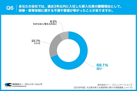 「Q6. あなたの会社では、過去3年以内に入社した新入社員の離職理由として、研修・教育体制に関する不満や要望が挙がったことがありますか。」(n=110)と質問したところ、「はい」が69.1%、「いいえ」が22.7%という回答となりました。