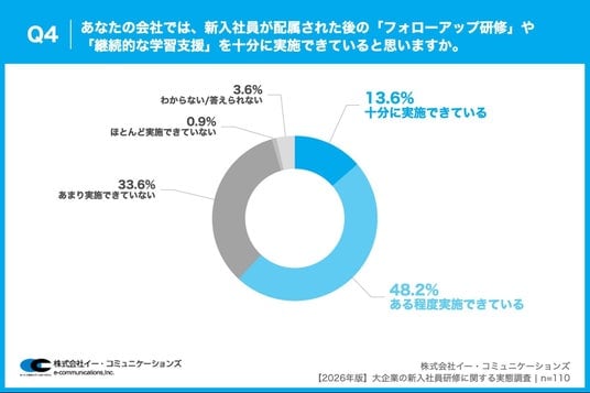 「Q4. あなたの会社では、新入社員が配属された後の「フォローアップ研修」や「継続的な学習支援」を十分に実施できていると思いますか。」(n=110)と質問したところ、「ある程度実施できている」が48.2%、「あまり実施できていない」が33.6%という回答となりました。