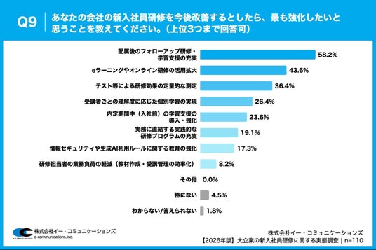 「Q9. あなたの会社の新入社員研修を今後改善するとしたら、最も強化したいと思うことを教えてください。(上位3つまで回答可)」(n=110)と質問したところ、「配属後のフォローアップ研修・学習支援の充実」が58.2%、「eラーニングやオンライン研修の活用拡大」が43.6%、「テスト等による研修効果の定量的な測定」が36.4%という回答となりました。
