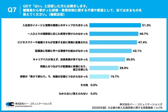 「Q7. Q6で「はい」と回答した方にお聞きします。離職者から挙がった研修・教育体制に関する不満や要望として、当てはまるものを教えてください。(複数回答)」(n=76)と質問したところ、「入社前のイメージと実際の業務とのギャップが大きかった」が51.3%、「一人ひとりの理解度に応じた教育が受けられなかった」が48.7%、「ビジネスマナーや基礎スキルが定着する前に現場に配属された」が47.4%という回答となりました。