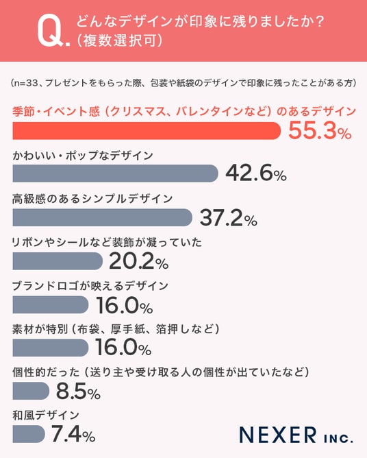 印象に残るデザインとしては季節・イベント感のあるものがもっとも多く、贈り物の特別感を演出するうえで包装が大きな役割を果たしていることがわかります。