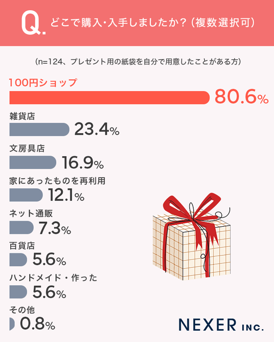 もっとも多かったのは「100円ショップ」で80.6%でした。次いで「雑貨店」が23.4%、「文房具店」が16.9%、「家にあったものを再利用」が12.1%と続きます。「ネット通販」は7.3%、「百貨店」と「ハンドメイド・作った」がともに5.6%でした。