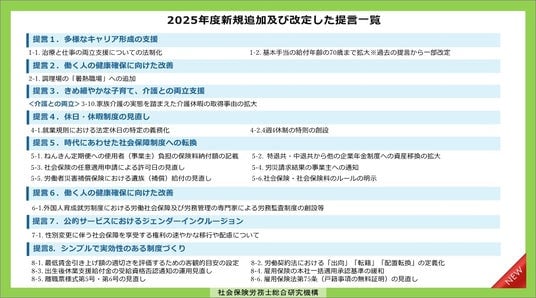 提言の取りまとめにあたっては、全国の社労士から広く意見募集を行っており、本年度は、過去の提言に新たな視点を加え改定した提言2項目と新たに寄せられた意見に基づく提言18項目を追加し、柔軟な働き方の推進を阻害している法制度や、現場で不公平・非効率な運用を生んでいる法規制の改善提案を中心に、62項目の提言を取りまとめた。