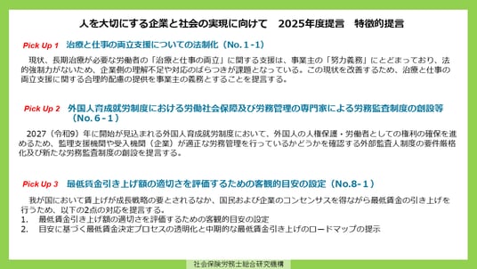 全国社会保険労務士会連合会は、『「人を大切にする企業」づくりから「人を大切にする社会」の実現』をコーポレートメッセージに労働法・社会保障制度及び人事・労務管理の専門家である社労士として、日頃から実務に携わる現場の視点に基づく政策提言を行っている。さらに、2025年の第9次社会保険労務士法改正により、「社会保険労務士の使命」として「適切な労務管理の確立及び個人の尊厳が保持された適正な労働環境の形成に寄与すること」が法に明記されたことを受け、連合会はこれらの使命の実現に資する政策提言として取りまとめ、真に人を大切にする社会の実現を目指している。