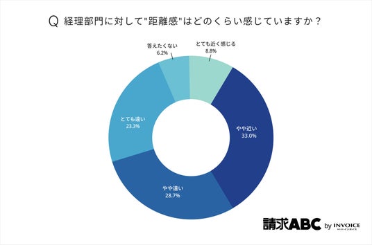 経理部門に対して感じている距離感について調査したところ、「やや近い」(33.0%)が最も多く、「とても近く感じる」(8.8%)と合わせると、近いと感じている回答は41.8%となりました。一方で、「やや遠い」(28.7%)、「とても遠い」(23.3%)を合わせた遠いと感じる回答は52.0%となっています。