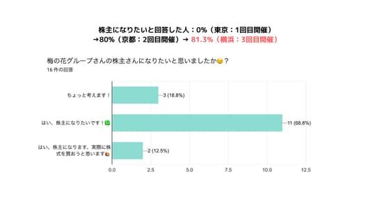 東京開催(店舗での食事会)では「株主になりたい」と回答したのが50%だったが、京都開催(工場見学・料理教室)では80% まで上昇。