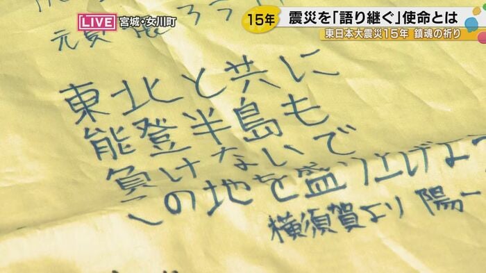 女川町では、地元の有志の方々が1400枚以上の「幸せの黄色いハンカチ」を駅前に掲げました。一枚一枚に町民からのエールが書かれており、その中には能登の皆さんへのメッセージも数多く寄せられていたといいます。