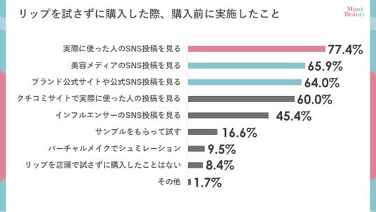 - 77.4%が実際に使った人のSNS投稿を見て、リップを試さずに購入する