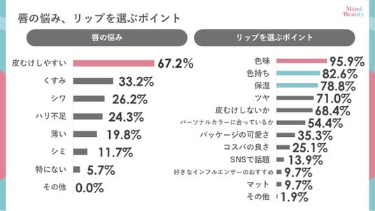 - 唇の悩みトップは「皮むけしやすい」こと、リップを選ぶポイントは「色味」、「色持ち」、「保湿」