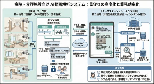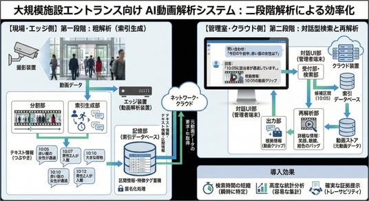本システムは、エントランスに設置したカメラで取得した動画データを、最新の生成AI技術で解析し、人流の把握や行動パターンの分析を行う。従来のセンサーベースの監視システムと比較して、より詳細で柔軟な分析が可能となる。