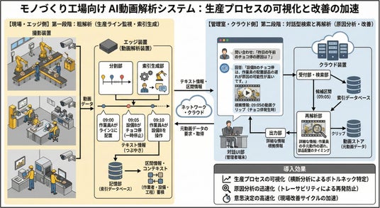 本システムは、生産ラインの映像をAIが解析し、「停止」「作業遅延」などの出来事を自動で記録・索引化します。管理者は「昨日のチョコ停の原因は?」といった問いに対し、該当時間の映像を即座に検索・確認することが可能です。これにより、生産プロセスの可視化、ボトルネックの特定、再発防止策の迅速な立案を実現します。