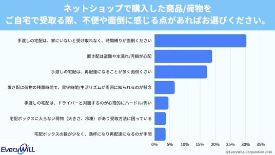宅配サービス利用者に荷物の受取り時に不便・面倒等に感じる点を確認すると、「手渡しの宅配は時間縛りが面倒」という回答が約3割(30.1%)で最多となりました 。これは、荷物を待つ「2~4時間」という時間が、生活者にとって「その場を離れられない」「何もできない」空白の時間=“自宅軟禁”として、極めて重いコストになっている実態を裏付けています 。