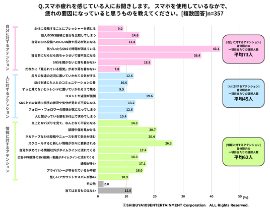 「スマホ疲れ」の要因を聴取したところ、最も多い回答は「気づいたらSNSで時間が消えている(43.1%)」、次いで「寝る前にだらだら見ちゃうせいで寝不足になる(36.4%)」「スクロールすると新しい情報が次々に更新される(26.3%)」という結果となり、ストレスを感じている項目として各分類内の一項目当たりの選択人数の平均が最も多かったアテンションは、「自分に対するアテンション」という結果となりました。(図3)