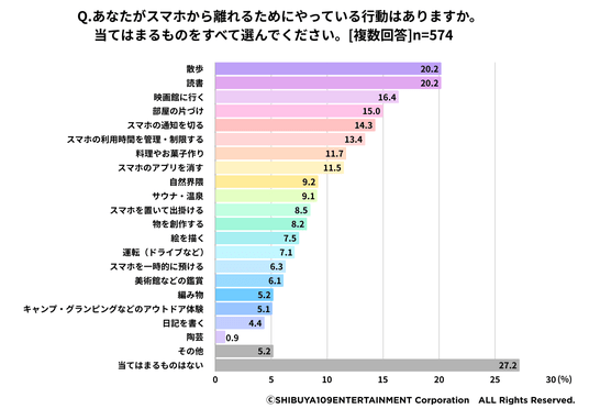 さらに、スマホから離れるためにやっていることがあると答えた若者は、すでに7割以上におよび、具体例として「散歩(20.2%)」「読書(20.2%)」「映画館に行く(16.4%)」といったアクティビティが挙げられています。スマホから離れ、「アテンション・デトックス」したいという欲望は、すでに実際の消費行動にも影響をおよぼし始めていることがわかります。(図7)