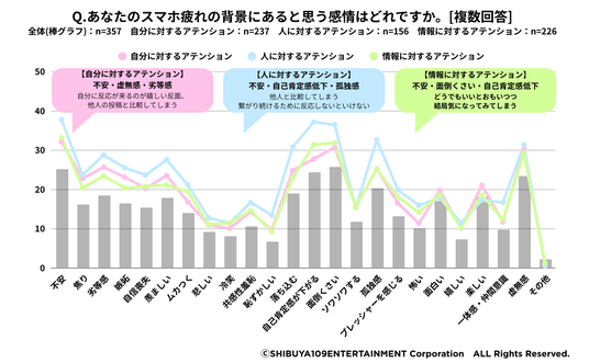 さらに、各アテンション別で見ていくと「自分に対するアテンション」については「不安(32.1%)」「虚無感(30.4%)」「劣等感(25.7%)」、「人に対するアテンション」については「不安(37.8%)」「自己肯定感が下がる(37.2%)」「孤独感(32.7%)」、「情報に対するアテンション」においては「不安(33.2%)」「面倒くさい(31.9%)」「自己肯定感が下がる(31.4%)」といった回答が全体の数値よりも高いことがわかりました。