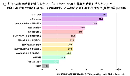 今回の調査でも、「SNSやスマホから離れた時間を持ちたい」と思っているZ世代は、スマホから離れた時間でやりたいこととして、「リラックス(43.6%)」「リフレッシュ(41.1%)」「一つのことに集中する時間を持つ(37.2%)」を挙げています。(図6)
