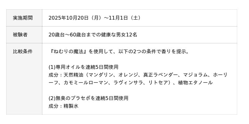 アロマディフューザーと精油を開発・製造・販売するアロマスター株式会社(東京都渋谷区、代表取締役:神田秀昭)は、香りと脳についての研究の第一人者、古賀良彦博士(杏林大学名誉教授)の監修のもと、20歳台~60歳台の健康成人を対象として、睡眠専用アロマディフューザー『ねむりの魔法』のための専用オイル『おやすみブレンド 熟睡』(以下、専用オイルと略す)の香りが睡眠に与える効果の実証試験を実施しました。