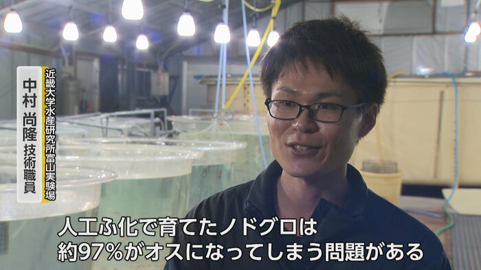 完全養殖成功の一方で、新たな課題も浮上している。「人工ふ化で育てたノドグロは約97%がオスになってしまう問題がある」と中村さん。ノドグロはオスよりメスの方が成長が早く大型化するため、「生産効率を高めるためにメスを多く育てていくための技術開発が必要」だという。
