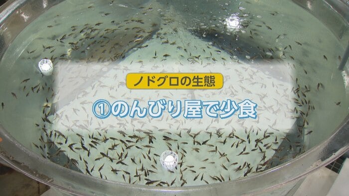 「エサを食べさせることが非常に難しい魚。他の魚だと水面が沸き立つぐらい勢いよく食べてくれるけど、この子たちゆっくりしか食べてくれなくて」と中村さん。のんびり屋さんというノドグロは、エサを与えても競い合うことはせず、あまり多くは食べない。照明の色や明るさを変えるなど工夫を凝らしているが、まだ大きな効果はなく、食べる気を起こさせる工夫が今後の課題だという。
