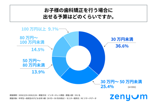 調査の最後、中学生~高校生の子どもを持つ親を対象に「お子様の歯科矯正を行う場合に出せる予算はどのくらいか」を尋ねる設問への回答では、1位が「30万円未満」で36.6%、2位が「30万円~50万円未満」で25.4%、3位が「80万円~100万円未満」で14.5%という結果になりました。この結果から、中学生~高校生の子どもの歯科矯正を行う場合の予算を「30万円未満」で考えている親が最も多いことが判明しました。