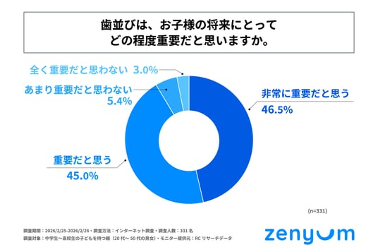 マウスピース矯正事業を展開する株式会社Zenyum Japan(本社:東京都港区 、代表取締役:岩永 拓朗)は、中学生~高校生の子どもを持つ親(20代~50代の男女)を対象に「子どもの歯並びに対する親の意識調査」を実施しました。この調査から、中学生~高校生の子どもを持つ親が、子どもの歯並びに対してどのように考えているか、また、子どもの歯科矯正を検討する上で重視する点、その課題などが明らかになりました。