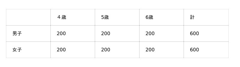 …幼児と小学生と中学生については、本調査で協力を得た日本全国の4歳~6歳の子どもを持つ保護者と、小学生(1~6年生)の子どもを持つ保護者と、中学生(1~3年生)の子どもを持つ保護者を、モニター母集団から抽出し、保護者付き添いのもとで、子ども本人が回答するように依頼。また、高校生については、日本全国の高校生(1~3年生)をモニター母集団から抽出し、回答を依頼。それぞれ、4歳~6歳各年齢で男子200人と女子200人ずつとその保護者(計1,200組)、小学1~6年生各学年で男子100人と女子100人ずつとその保護者(計1,200組)、中学1~3年生各学年で男子100人と女子100人ずつとその保護者(計600組)、高校1~3年生各学年で男子100人と女子100人ずつの回答が集まったところで調査を終了。