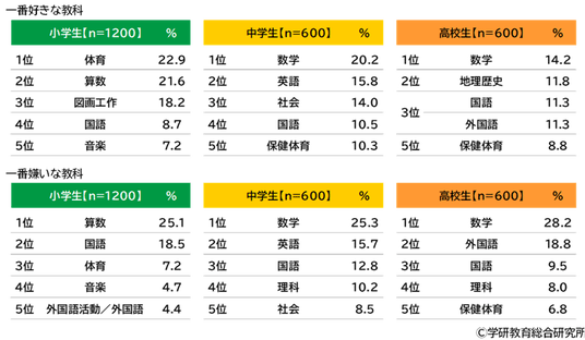 一番好きな教科をきいたところ、小学生では1位「体育」(22.9%)、2位「算数」(21.6%)、3位「図画工作」(18.2%)、中学生では1位「数学」(20.2%)、2位「英語」(15.8%)、3位「社会」(14.0%)、高校生では1位「数学」(14.2%)、2位「地理歴史」(11.8%)、3位「国語」「外国語」(いずれも11.3%)となりました。