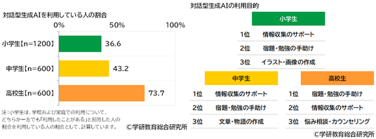 使用目的TOP3「情報収集のサポート」「宿題・勉強の手助け」「文章・物語の作成」