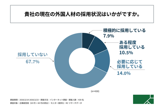 次に、企業経営者を対象に「自社の現在の外国人材の採用状況」を尋ねる設問への回答では、1位が「採用していない」で67.7%、2位が「必要に応じて採用している」で14.0%、3位が「ある程度採用している」で10.5%、4位が「積極的に採用している」で7.9%という結果になりました。「採用していない」という回答が最も多いものの、2位から4位の各回答の比率を合計すると32.4%となり、この結果から、企業の3社に1社以上が、程度の差こそあれ、外国人材を採用していることが判明しました。