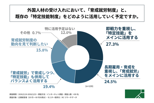 調査の最後、外国人材を採用している企業経営者を対象に「外国人材の受け入れにおいて、『育成就労制度』と、既存の『特定技能制度』をどのように活用していく予定か」を尋ねる設問への回答では、1位が「即戦力を重視し、『特定技能』をメインに活用する」で27.3%、2位が「長期雇用・育成を重視し、『育成就労』をメインに活用する」で24.5%、3位が「『育成就労』で育成しつつ、『特定技能』も併用してバランスよく活用する」で19.4%という結果になりました。この結果から、外国人材を採用している企業の4社に1社以上が、外国人材の受け入れにおいて、即戦力を重視し「特定技能制度」をメインに活用する予定であることがわかりました。