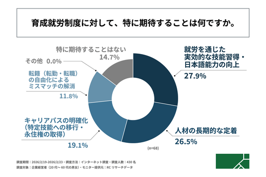 また、育成就労制度の具体的な内容を理解している企業経営者を対象に、「育成就労制度に対して、特に期待することは何か」を尋ねる設問への回答では、1位が「就労を通じた実効的な技能習得・日本語能力の向上」で27.9%、2位が「人材の長期的な定着」で26.5%、3位が「キャリアパスの明確化(特定技能への移行・永住権の取得)」で19.1%という結果になりました。この結果から、育成就労制度の具体的な内容を理解している企業経営者が、その制度に特に期待することは、「就労を通じた実効的な技能習得・日本語能力の向上」や「人材の長期的な定着」であることが明らかになりました。