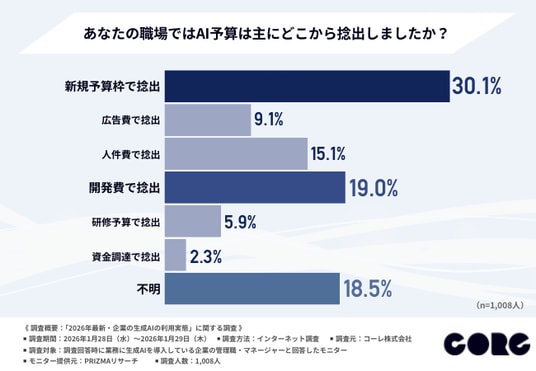 「あなたの職場ではAI予算は主にどこから捻出したか」について尋ねたところ、『新規予算枠で捻出(30.1%)』が最も多く、『開発費で捻出(19.0%)』『不明(18.5%)』と続きました。