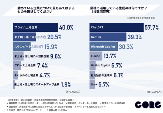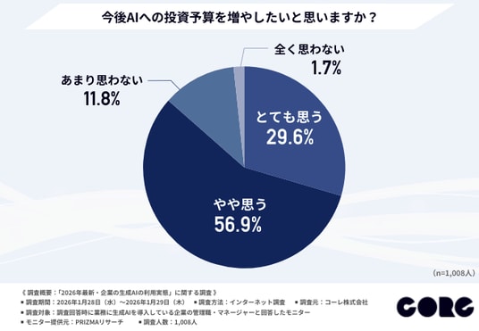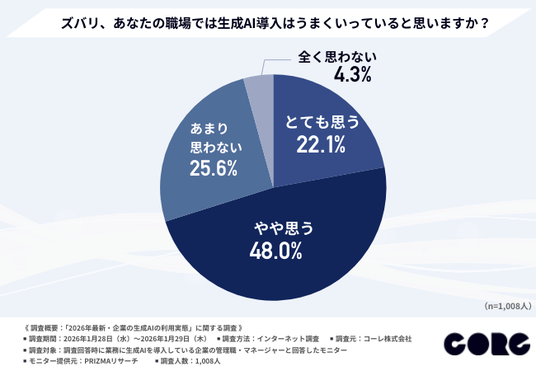 AIコネクティブカンパニーのコーレ株式会社(本社:東京都新宿区、代表取締役:奥脇 真人)は、ビジネスリーダー(企業の管理職)約1,008名を対象に、「2026年最新・企業の生成AIの利用実態」に関する調査を実施しました。2025年版はこちら