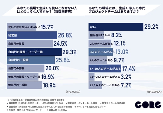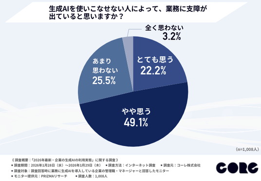 【2026年最新・企業の生成AIの利用実態】AI活用は進む一方、7割超が「使いこなせない層による業務支障」を実感。使いこなせない最多は「課長・リーダー職」。管理職1,008名調査で見えたAI定着の壁