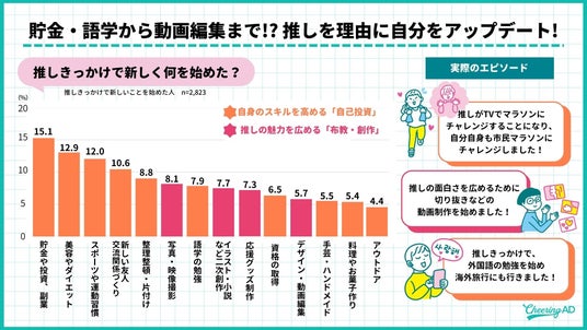 その挑戦は、貯金や片付けといった身近な生活習慣から、デザインや動画編集といったクリエイティブスキルの習得まで多岐にわたります。自分のスキルを高める「自己投資」や推しの魅力を広めるための「布教・創作」といった応援のステップアップへと直結しています。