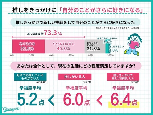 ると、推しがいない層は「5.2点」に対し、推しきっかけで新しい挑戦をした層は「6.4点」と上昇す